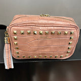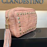 Bolso bandolera ,confeccionado en piel de vacuno con tachas metálicas .